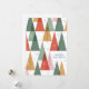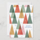 This modern holiday card presents a playful forest scene composed of colorful geometric tree shapes in shades of green, orange, pink, and red. The abstract trees are complemented by delicate snowflakes scattered throughout the design, giving it a festive wintery feel. The "Happy Holidays" message is subtly placed in bold blue lettering, adding a touch of elegance to the vibrant and creative illustration. Ideal for sending warm holiday wishes with a contemporary twist.