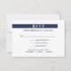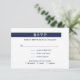 Chic modern wedding RSVP features minimalist navy blue text on a white background on the front with customizable menu options. Near the top is a horizontal navy line that goes most of the way across with the letters RSVP in white inside it. Personalize the text in the sidebar. The back is dark blue with white stripes that don't extend all the way across. The lines form an undulating geometric pattern.