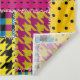 Geometric patchwork rectangle forms an intriguing background.