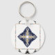 This keychain features a striking and modern geometric pattern that creates an eye-catching design. The repeating motifs of stylized arches and circles in vibrant orange and blue stand out against a deep black and white background. It's a stylish and unique accessory, perfect for adding a pop of color and a touch of abstract art to your keys or bag.