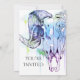 All occasion party invites easy to read for you to personalize. These feature an artistic ram skull drawing with geometric touches here and there and watercolor splashes and drips in the colors of blue purple and yellow on white on one side.