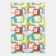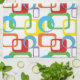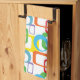 The colorful graphic geometric pattern on this tea towel features rounded rectangles and circles with offset cutouts, reminiscent of mid century modern design, has been updated with a lively palette of various colors.
