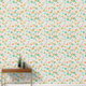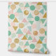 This delightful and playful seamless pattern features an energetic arrangement of geometric shapes, including triangles, circles, and semicircles. The design is rendered in a soft, modern pastel palette of mint green and blush pink, complemented by pops of shimmering gold and textured patterns.