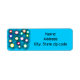 These return address labels have a geometric design of circles of different colors with lines coming out on a field of blue.
