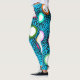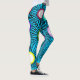 These leggings have a geometric design of circles of different colors with lines coming out on a field of blue.