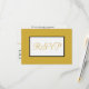 Gold color backgrond on front with RSVP written in gold color script against white and black geometric recetangle. Personalize backside with reception party food choice and other details. Food allergies note at bottom (keep as is, or delete). Original Design by TamiraZDesigns.