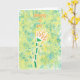 Pretty yellow orange abstract flower in a geometric style, on an abstract background of yellow and turquoise, is printed on custom greeting cards. The text on the front says, Thinking of you, in orange letters outlined in white. The flower is also outlined in white and orange. The text can be customized with your own greeting. There is a text placeholder inside for you to type your own message, or delete, if you choose to write a message in by hand later. Thank you for shopping at CherylsArt on Zazzle.