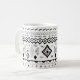 Geometric and organic elements co-mingle in a lively, but rhythmic, circular dance around this beverage container. The primordial chaos of flora and fauna are depicted, pastured by triangular elements that hearken back to man's first valiant attempts to domesticate nature. An emerging face represents man- wild, nascent and inquiring.