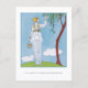 A postcard featuring the French fashion illustration, La Saison des Prunes Mirabelles (The Season of the Mirabelle Plum) from 1914 by George Barbier (1882–1932), showing a woman in a white ruffled dress picking plums from a tree. This is a digitally restored image from the Gazette du Bon Ton.