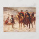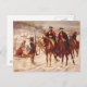 George Washington and Marquis de Lafayette on horseback at winter quarters in Valley Forge, Pa.; soldiers huddled around campfire in background.
