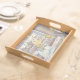 This is a well made, sturdy wooden tray with a flawless black finish and lovely map on the tray surface. It is both vintage & modern at the same time. Looks exactly like the photo; does not disappoint. So nice to find something of quality individually made and not the mass-produced 'shabby chic' merchandise seen in stores. I am so pleased to be able to give this to my college-age niece for her birthday. This can be used as a tray to hold jewelry or toiletries, or hung on the wall as art. The map surface is sealed (it is slightly shiny) so would be moisture resistant. It is well worth the asking price but I was able to apply a sale code as well. Very happy with my purchase. Map is crisp & clear and sealed with a water-resitant finish.