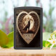 A heart-shaped wooden carving depicts a wolf howling at the full moon, surrounded by stylized branches. The carving is signed George and Wolf Moon, suggesting it is a personalized piece of artwork.