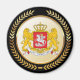 The national coat of arms of Georgia is infused into a faux gold circle shape which itself is set between a faux gold laurel wreath.