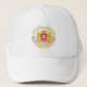 The national coat of arms of Georgia is infused into a faux gold circle shape which itself is set between a faux gold laurel wreath.