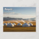 A ger camp on the Mongolian steppe sits lightly on the land, with round white felt tents arranged in a loose circle across open grassland. Smoke drifts from small stovepipes, and paths worn by footsteps connect each ger without disrupting the surrounding space. The setting feels quiet and expansive, framed by low hills and an enormous sky that shifts in color from dawn to dusk.