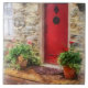 Designs by Susan Savad -- Charming suburban scene with its large pots of geraniums in front of a flagstone home with a brilliant red door.