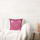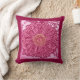 Throw pillow in a block print of a Gerbera daisy, based on a photograph, digitally transformed and hand tinted - shades of fuchsia pink with deep maroon / burgundy and shell pink, with a deep maroon / burgundy border