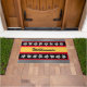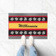German inspired door mat done in a black and white check pattern, with red accents and graphics of Edelweiss flower borders. Black custom text, in the bold yellow middle of the mat, reads Welcome in German, Willkommen, and can be changed to read what you want.