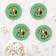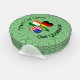 Personalized round coaster set shows shamrock with a different flag in each leaf. One for Germany. One for Ireland. And one for United States of America. Background is a fractal of light green squiggly squares. Words read THREE CULTURES on top and ONE YOURNAME on the bottom. Words are in dark green, Celtic style, circular letters. To personalize, add a name in the appropriate place. For a gift, add someone else's name. Designed to celebrate German holidays (such as Oxi Day), Irish holidays (such as St. Patrick's Day), and USA holidays (such as Independence Day or July 4th). Perfect housewarming gift for the home bar.
