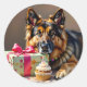 Cute birthday stickers. A cute German Shepherd dog with her head resting on a birthday present.