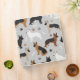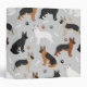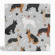 Cute German Shepherds in black and tan, black and red, black and silver, white and back color coats sit and stand with scattered dog bones and paw prints on a light gray background.