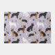 Cute German Shepherds in black and tan, black and red, black and silver, white and back color coats sit and stand with scattered dog bones and paw prints on a light purple background.