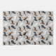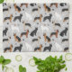 Cute German Shepherds in black and tan, black and red, black and silver, white and back color coats sit and stand with scattered dog bones and paw prints on a light gray background.