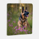 This ornament features a warm season image of a German Shepherd on one side and a holiday or Christmas image on the other. Can be used all year round!