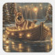 Set sail into the magic of the holiday season with this beautifully detailed illustration, showcasing a proud dog sitting in a festively decorated boat, gliding across a serene Christmas lake. The twinkling lights from nearby pine trees reflect off the water, casting a warm, festive glow that enhances the cozy ambiance. Ornaments dangle from the boat's sides, while glowing lanterns light the way, creating a scene that captures the true essence of Christmas warmth and joy. This nostalgic artwork brings a touch of holiday magic to any space, perfect for those who cherish the spirit of the season.