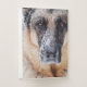 Close-up photo of a German Shepherd Dog's face covered in snow.