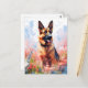 Colorful watercolor artwork of a German Shepherd sitting in a field of spring flowers.