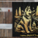 Elevate your bathroom decor with our luxurious black and gold shower curtain featuring a majestic German Shepherd sitting proudly on a hill.