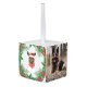 German Shepherd Dog Breed Photo And Name Christmas Cube Ornament features a beautiful watercolor of a German Shepherd with a red Santa's Hat and a red Christmas scarf, red and green Christmas greenery with pine branches.