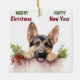 Here's a cute Holiday ornament that would make a great gift for a grandchild, son, daughter, or anyone. One side has the image of an adorable German Shepherd Dog peeking over a fence that is decorated with holly leaves and red berries. The green and red text at the top says "MERRY CHRISTMAS" and "HAPPY NEW YEAR". The other side has another image of the dog wearing a red and white Santa hat, with your own personalized text. Make it say whatever you'd like!