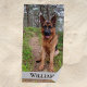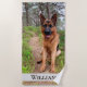 A German Shepherd sitting on a narrow winding path in a pine forest, waiting. A dog with brown and black fur. A light gray frame and a template for your name. Black block letters.