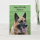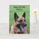 A doggy lover's Happy Birthday card featuring a handsome German Shepherd dog. The photo is close up on the Alsation's face. You can personalize the name and greeting on the front, and the words inside.