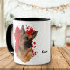 A beautiful portrait of a German Shepherd Dog stands out against a bright red abstract paint splatter background. The image is on two sides of the mug, with your name or other custom text in black between them.