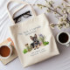 Personalized cotton tote with German shepherd and herbs design. Customize text in two places with name of the farm, homestead, or business, and address. A shepherd puppy lies next to jars of herbs in this design. Printed text is dark blue. The back of this bag is blank.