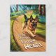 A German Shepherd runs down a winding path through a forest, with sunlight streaming through the trees. The dog is in mid-stride, with its tongue out and a determined look on its face. The path is bordered by lush green grass and wildflowers, and the air is filled with the sounds of nature. The inspirational quote Lead with Strength, Follow with Heart is written across the path.