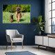 Poster of German Shepherd mom and pup running, the mom has a large stick in her mouth and they are running in a green grassy field!