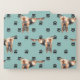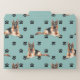 An image of a German Shepherd Dog is on this set of file folders. Each individual folder has the dog wearing a blue bow tie amid a pattern of black paw prints. There is one folder with a light gray background, one with a light mint green background, and one with a light gray blue background, so you can easily identify each separate folder. The insides match the background color of the outsides. Perfect for keeping your dog records in, or just for fun!