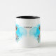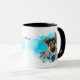 This pretty mug features a watercolor portrait of a beautiful German Shepherd puppy against a vivid blue watercolor splash background. The puppy peeks out from a pretty blue and salmon pink floral bouquet. The image is printed twice on the mug, with your name or other text between them.