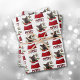 The repeated pattern on these Christmas wrapping paper sheets is an image of a cute German Shepherd Dog puppy peeking out from a red and white Holiday gift bag. Behind him is a sprig of holly and red berries. Stylized red and black buffalo plaid text says MERRY CHRISTMAS". The background on two of the sheets in this set is white, while the third sheet is silver.