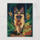A German Shepherd runs through a forest, its paws hitting the dirt path. The dog has a determined look on its face and its tail is wagging slightly. The words Lead With Strength, Follow With Heart are printed on the right side of the image.