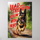 A German Shepherd dog runs down a dirt path with a determined expression. The dog is depicted in a stylized, almost cartoonish manner, with bold, graphic lines. The image is accompanied by the text Lead with Strength, Follow with Heart.