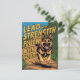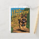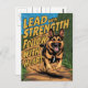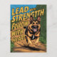 A German Shepherd runs towards the viewer on a dirt path, with the words Lead with Strength, Follow with Heart in a comic book style font behind it.