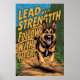 A German Shepherd runs towards the viewer on a dirt path, with the words Lead with Strength, Follow with Heart in a comic book style font behind it.