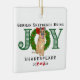 This ornament features a German Shepherd sitting in front of a wreath. The German Shepherd may appear softer in focus to the technique of the illustration. The wreath makes up the letter “O” in joy. Above the German Shepherd, it reads, “German Shepherds Bring.” The complete message on the ornament reads, “German Shepherds Bring Joy.” You personalize the ornament with your dog’s name. Under your dog’s name, there is a candy-striped bone and the year 2024. The candy-striped dog bone appears again on the back of the ornament at the lower portion of the ornament. You can type a sweet note to your fur baby on the back if you desire.