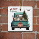 A teal blue retro pickup truck carries a decorated Holiday tree and gift packages on this cute ceramic Christmas ornament. Looking out from the tailgate is a brown and white German Shorthaired Pointer dog. A rustic wooden sign on the back bumper says "Christmas Cheer". The red and green stylized text at the top left says "MERRY CHRISTMAS", with your name (or your dog's) and the year at the right. Both sides have the same image.