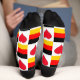 This fun Halloween socks are bright and colorful. The small print is crisp and shows the fun details. The softness of the socks feels nice on my feet and ankles. .